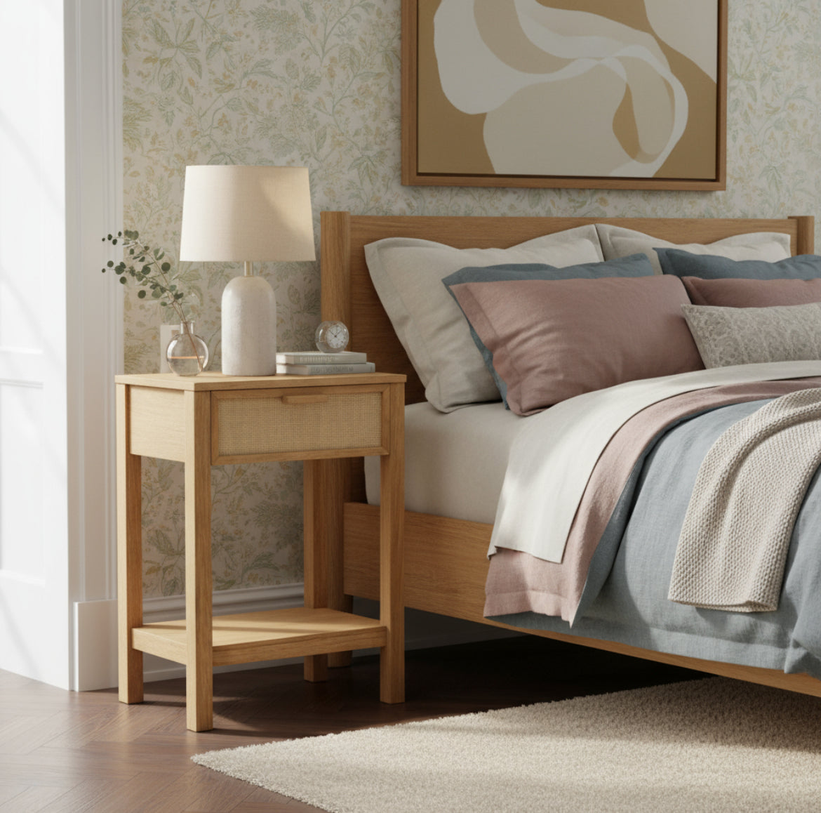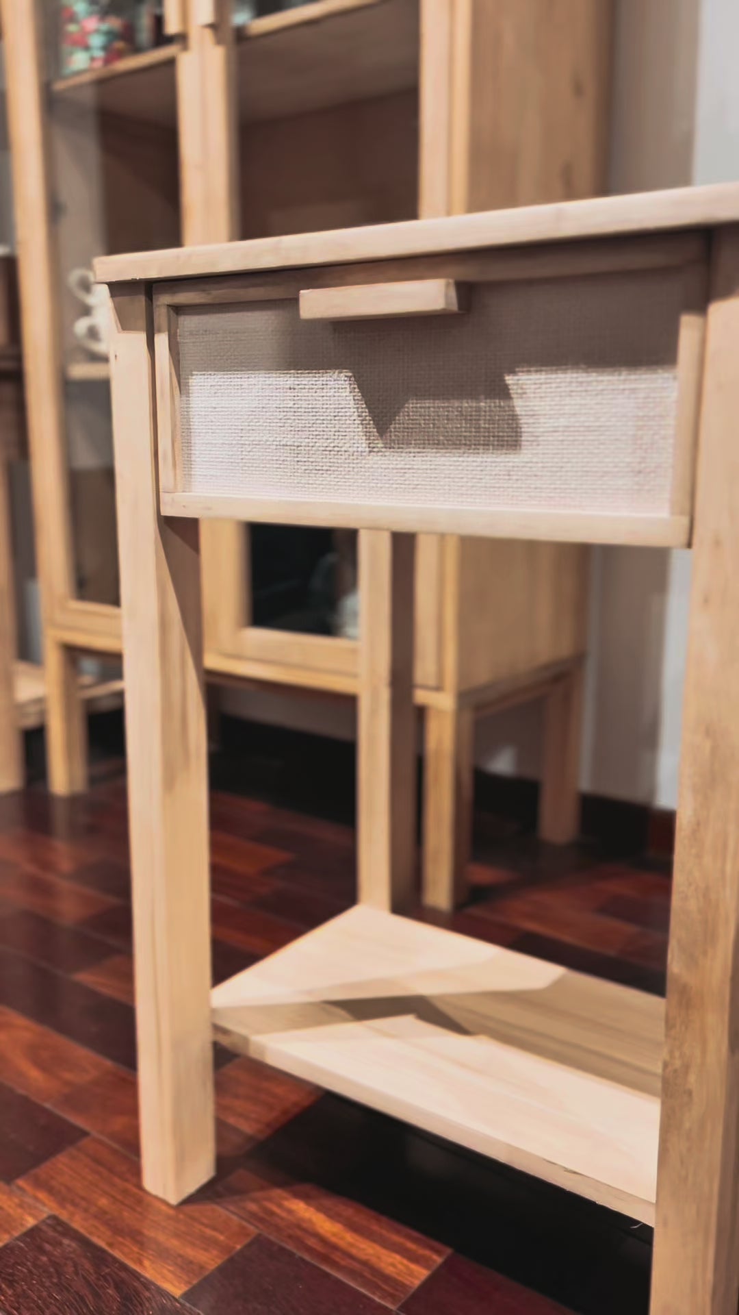 La mesa cuenta con un cajón revestido con tejido de fibras naturales, que puede presentar irregularidades en textura y color, lo que añade un toque de autenticidad.